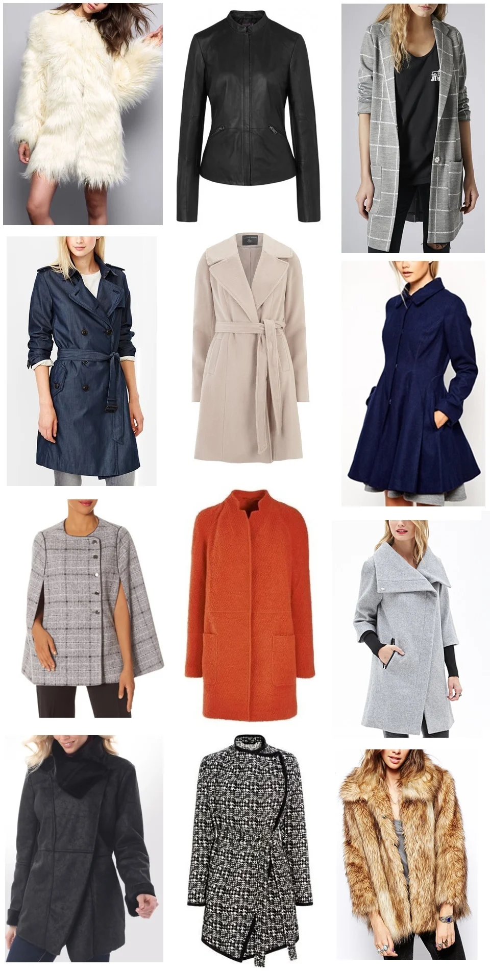 TALL OUTERWEAR SOIREE (top to bottom, left to right): YETI COAT - TTYA for Long Tall Sally/SOFT LEATHER JACKET - Long Tall Sally/TALL GRID CHECK JACKET - TopShop/CLASSIC INDIGO TRENCH - Gap/TALL BLUSH FIT AND FLARE COAT - Dorothy Perkins/TALL DOLLY SKATER COAT - ASOS/SCANDAL COLLECTION PLAID CAPE - The Limited/ORANGE BOUCLE COAT - Next/HEATHER DOUBLE-SLEEVE COCOON COAT - Forever 21/Madison Coat - LEL/CHECKED BLANKET COAT - Next/TALL VINTAGE FAUX FUR COAT - ASOS/